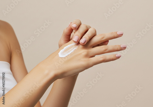 Woman applying white moisturizing cream on her hand in front of a neutral background indoors