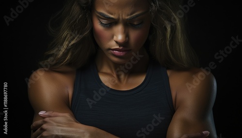 woman, arm, crossed, looking, down, dark, female, person, downcast, studio, portrait, black background, one person, human, arm, closeup, head shot, upper body, sombre, low key, monochromatic, serious, contemplative, intense, melancholy, thoughtful, isolated, pensive, portraiture, indoor, front view, dramatic, powerful, strong, emotional, still life