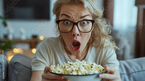 woman, popcorn, portrait, entertainment, shock, sofa, television, snack, emotion, watching, surprised, reaction, holding, fun, goggles, living room, expression, person, leisure, adult, facial, excited, casual attire, amazement, lifestyle, enjoyment, indoor, humor, female, intense, viewer, viewing, sharpened, blond, activity, candid, dramatic, interest, engrossed, recreational, stunned, thrilling, emotionally, concentrating