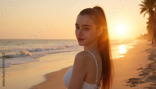 woman, beach, sunset, ocean, golden hour, summer, girl, beautiful, model, tropical, sand, coastline, sun, hair, sunlight, landscape, vacation, travel, holiday, relax, serene, peaceful, young, happy, carefree, beauty, skin, fashion, swimwear, portrait, backview, sea, wave, horizon