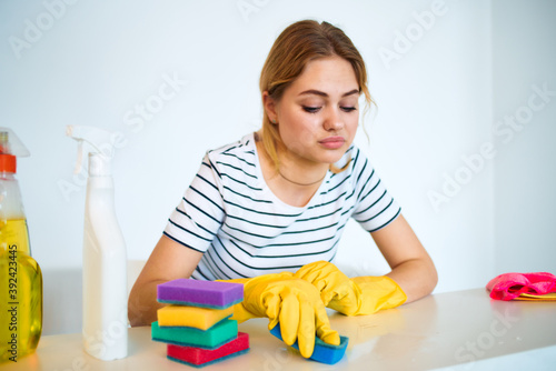 Woman at the table washing supplies housework hygiene service