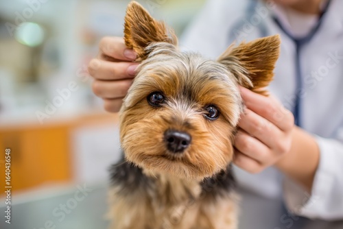 Woman at vet with Yorkshire terrier vet examining dog s ears focusing on its muzzle
