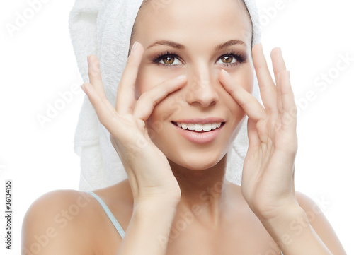 attractive, beautiful, beauty, female, girl, happiness, happy, joy, lady, model, person, portrait, pretty, toothy smile, smiling, studio, white, woman, young, adult, isolated on white, face, skin, health, teeth, hand, spa, care, towel, massage
