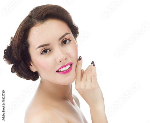 attractive, beautiful, beauty, female, girl, happiness, happy, joy, lady, model, person, portrait, pretty, toothy smile, smiling, studio, white, woman, young, adult, isolated on white, face, skin, health, teeth, hand, make-up, cosmetic, spa, care, brunette, nail, hair
