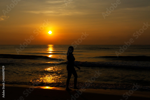Woman body big with bikini and sunrise on beach