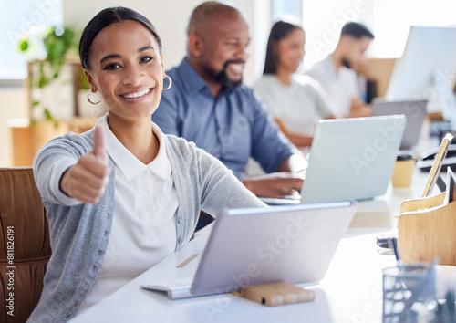 Woman, business and thumbs up in office with laptop, coworking and workplace or company collaboration mission. Employee, achievement and job well done, corporate and online emoji or ok gesture