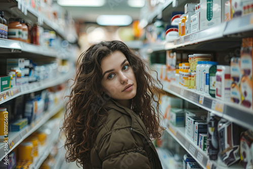 woman buying a medicine in a pharmacy and looking at camera