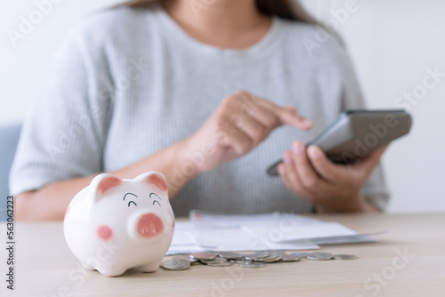 Woman calculating money to save for household expenses in piggy bank