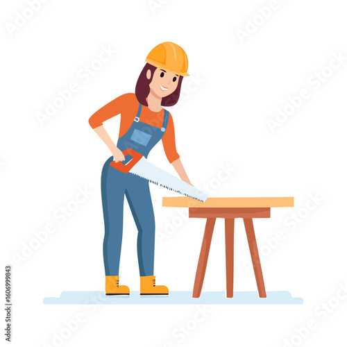woman, carpenter, female, men at work, construction, building, bricolage, craft, carpenter's shop, handsaw, sawing, wood, plank, timber, material, tool, equipment, safety, helmet, hard hat, overall, workwear, professional, skilled, trade, occupation, industry, labor, project, creation, making, cutting, process, activity, hobby, leisure, domestic, home, improvement, renovation, repair, design, furniture, carpenter's shop, joinery, workshop, studio, creative, artistic