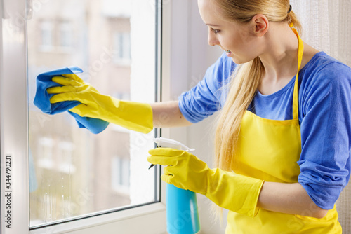cleaning, window, laundered, clean, home, spray, pane, cleaner, housework, clothes, glasses, rag, detergent, woman, washing, glove, yellow, maid, house, blue, teenage, adult, indoor