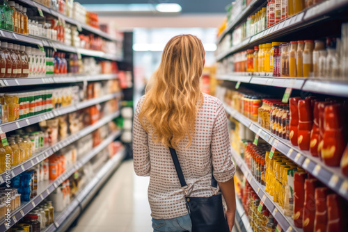Woman comparing products in a grocery store, considering nutrition, prices, and ingredients, demonstrating informed consumer behavior, generative ai