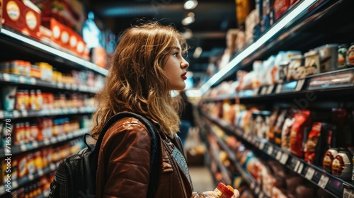woman comparing products in a grocery store, supermarket, store, retail, food, shopping, groceries, consumerism, choice, customer, market, purchase, buy, sale, consumer, choosing