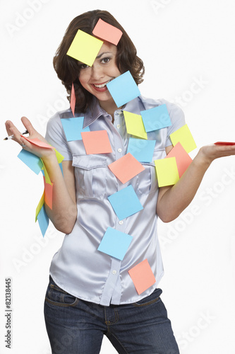 achievement, business, businesswoman, tied-up, caucasian, chaos, color image, concept, cut-out, frustration, happy, list, memory, one person, organisation, overworked, people, photo, portrait, posing, reminder, smiling, standing, stress, studio shot, vertical, white background, woman, working, workload, young adult