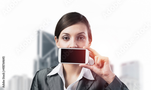 attractive, beautiful, blank, building, business, businesswoman, mobile phone, charming, city, city landscape, closeup, communication, corporate, cover, device, digital, display, downtown, electronic, face, female, contraption, hide, holding, lady, layout, mobile, mobility, monitor, mouth, person, phone, portrait, pretty, screen, show, sky, smartphone, standing, studio, suit, technology, touch screen, urban, vision, web, woman, young