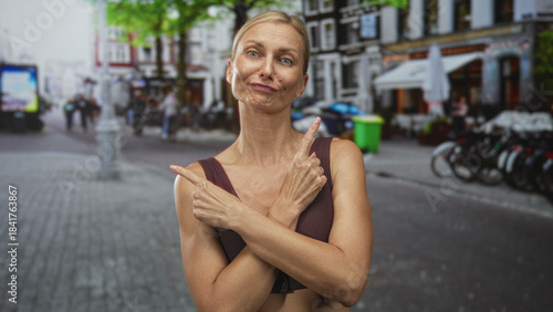 woman, finger, pointing, street, fitness, sport, female, blond, city, confidence, curiosity, playful, self-assured, determination, smile, expression, attitude, thoughtful, pondering, physical exercise, training, exercise, activewear, bra, ponytail, outdoors, pavement, bicycle, cafes, building, pedestrian, gesture, direction, arm, athletic, toned, mature, wellness, healthy, bold, assertive, navigation, choice, decision, movement, route, smirk