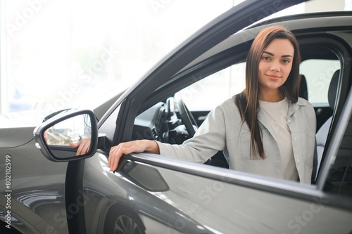 woman customer female buyer client chooses auto. Sales concept
