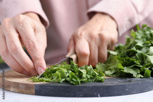 aromatic, background, board, bunch, cilantro, closeup, condiment, cook, cooking, coriander, cookery, culinary, cut, cutting, delicious, eating, female, favor, food, fresh, gastronomy, epicure, green, hand, healthy, herb, herbal, ingredient, kitchen, knife, leaf, leaf, light, meal, natural, nutrient, nourishment, organic, person, plant, raw, receipe, seasoning, table, vegan, vegetarian, vitamin, woman