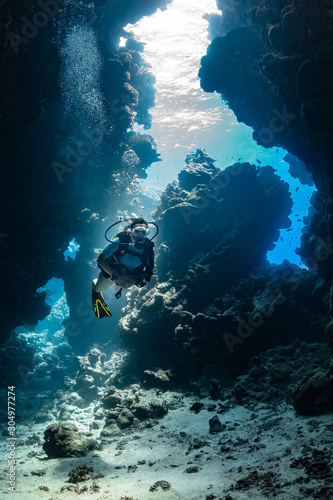 woman diver visiting underwater cave in the Red Sea, egypt, Shaab Claude