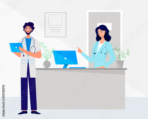 Woman doctor and man doctor with smartphone and computer. Consultation and Medical clinic reception.