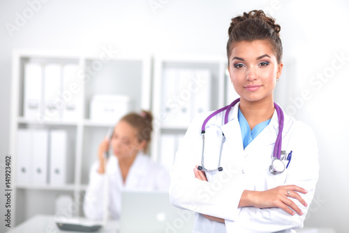 doctor, woman, young, white, background, laboratory, coat, isolated, 2, medicals, year, view, practitioner, shot, happiness, adult, stethoscope, studio, occupation, 1, caucasian, men at work, female, smiling, medicine, confidence, general, nurse, listening, front, lifestyle, up, folder, science, person, expertise, professional, waist, cheerful, health, camera, health care