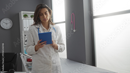 woman, doctor, tablet, hospital, stethoscope, clock, health care, clinic, indoor, professional, medicals, female, nurse, technology, office, patient, consultation, uniform, care, medicine, expert, study, treatment, equipment, practice, health, modern, interior, facility, men at work, job, exam, diagnosis, physician, staff, workplace, appointment, clinical, occupation, service, specialist, examining, room, caregiver, diagnostic, reading, hispanic, adult, attractive