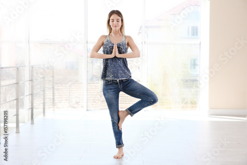 Woman doing yoga and listening to the music at home