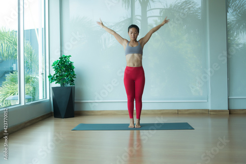 woman doing yoga. Sport woman wearing sport suite practice asana meditation flexibility yoga sport healthy concept playing indoor gym.