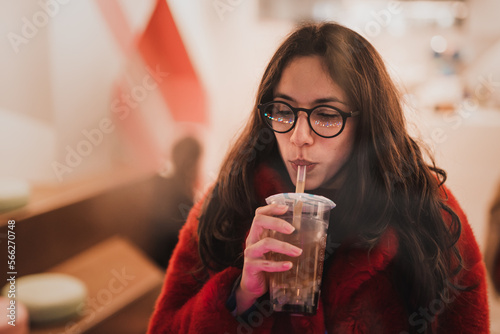 woman, drink, cafes, to go, disposable, straw, weekend, eyeglass, beverage, rest, female, young, warm clothes, london, england, hot drink, relax, positive, enjoy, trendy, chill, urban, take-away, break, refreshment, carefree, cafeteria, cup, curly hair, blurred background, looking away, bokeh, thoughtful, pensive