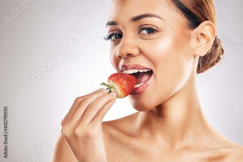 Woman, eating strawberry and skincare portrait, beauty or eco friendly product and natural cosmetics in studio. Happy person, face and red fruit for vegan makeup or dermatology on a white background