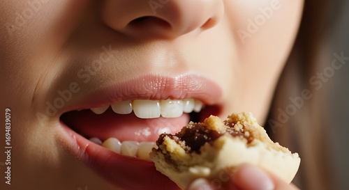 woman, eating, pastry, cookie, dessert, sweet, food, closeup, mouth, teeth, bite, delicious, tasty, snack, treat, bakery, confectionery, chocolate, caramel, ravenous, appetence, enjoying, food photography, culinary, female, girl, landscape