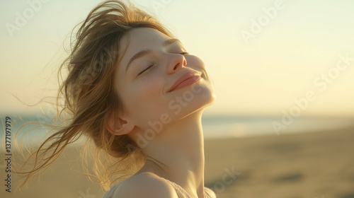 Woman embracing ocean breeze at golden hour, serenity in solitude