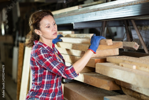 Woman employee of carpentry workshop takes out necessary board from stack of materials, transfers it to processing site, prepares for work