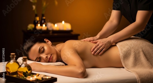 Woman enjoying a relaxing back massage at a luxurious spa. Focus on relaxation, wellness, and self-care.