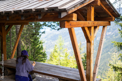 Woman enjoying landscape on a picnic rest area in the mountain. Healthy lifestyle