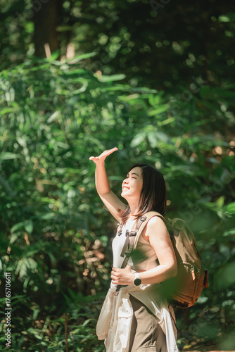 woman, hiking, nature, forest, sunlight, backpack, adventure, greenery, joy, exploration, travel, summer, relaxation, health, fitness, wellness, emotion, beauty, serenity, wild, landscape, leisure, environment, lifestyle, freedom, sunshine, path, tree, leaf, wanderlust, life events, young, cheerful, active, standing, breathing, moment, happiness, scenery, discovery, wander, calmness, scenic, peaceful, joyfulness, asian, asia