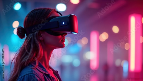 Woman experiences virtual reality event. VR headset worn in bright space. Holographic networking displayed. Futuristic tech environment. Colorful lights. Interactive simulation. Modern design.