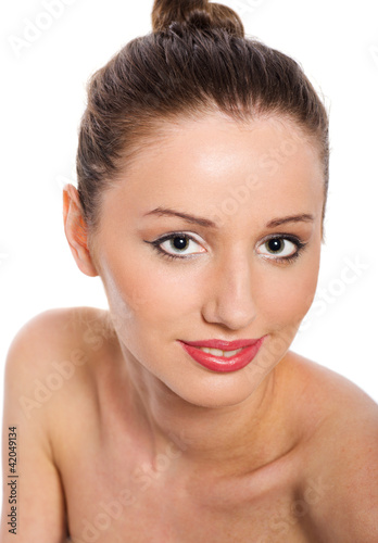 1, face, isolated, white, head, caucasian, portrait, beautiful, skin, young, beauty, smiling, woman, only, closeup, 20s, elegance, clean, serene, well-being, calm, charming, fresh, freshness, girl, healthy, make-up, natural, posing, purity, sensuality, skincare, treatment, wellness, youth