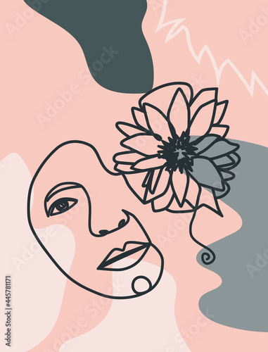 Woman face with flowers one line drawing. Half of the face is a flower. Continuous line drawing art. Nature cosmetics.