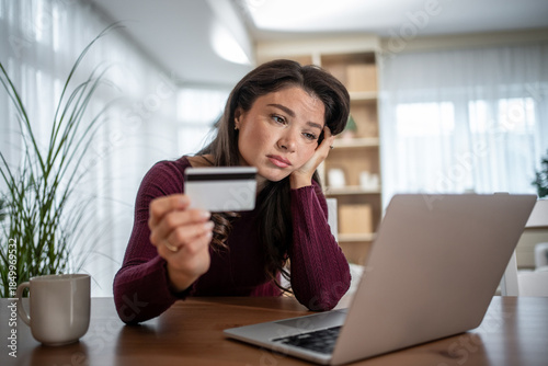 woman, stress, financial, debt, worried, problem, online shopping, credit card, fraud, computer, laptop, home, female, payment, cyberspace, thinking, contemplating, concern, serious, young adult, frustrated, confused, sad, depressed, burden, crisis, bankrupt, spending, budget, expense, poor, bankruptcy, management, struggle, bill, paying, account, unhappy, desperate, adult, long hair, casual attire, indoor, real people, modern, purchasing, consumer, e-business