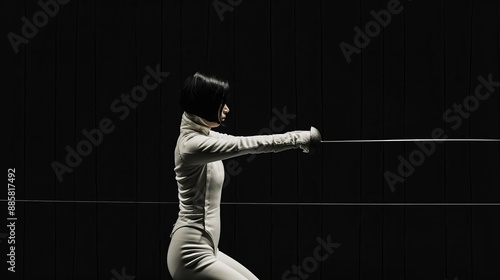 fenced, woman, female, sport, sword, lunge, action, fencer, athlete, precision, strength, sharpened, determination, minimalist, elegance, black background, discipline, martial art, dynamic, movement, fitness, combat, competition