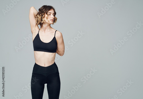 Woman fitness gymnastics joined hands behind back leggings model