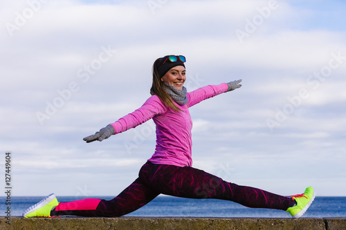 Woman fitness sport girl training outdoor in cold weather