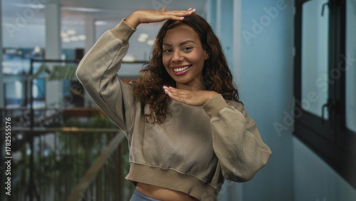 woman, hand, smiling, building, hotel, indoor, female, young, smile, gesture, joy, confidence, expression, empowerment, wellness, positivity, warmth, relaxed, approachable, natural, pose, framing, face, sweatshirt, crop, casual attire, adult, candid, comfortable, cosy, expressive, gesture, communication, nonverbal, emotional, youthful, beaming, modern, lighting, relaxation, movement, interaction, openness, sincerity, railing, plant, window, corridor