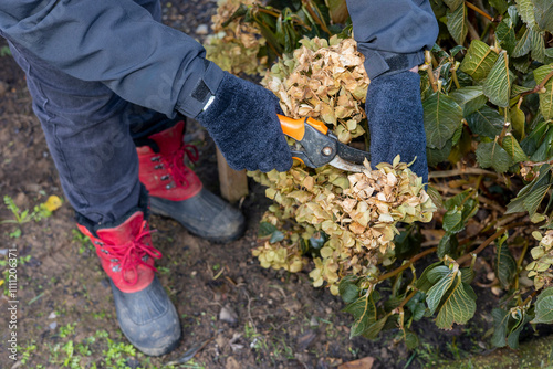 woman, person, gardener, pruning, hydrangea, flower, spike, shear, hand, pruning shears, autumn, backyard, garden, shrub, winter, gardening, maintenance, plant, tool, glove, boot, outfit, attire, clothing, footwear, work, chore, activity, cold weather