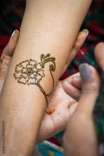 Woman gets traditional mehendi henna decoration for a Hindu wedding