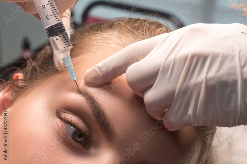 Woman getting cosmetic injection of botulinum near eyes. Crow's feet wrinkles. Eyebrow mesotherapy.