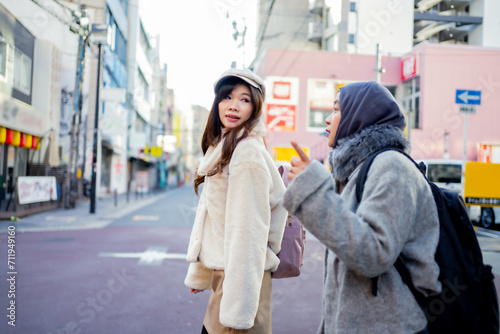 woman girl tourist Two Asian friends but different religions, one of whom is a Muslim girl. Walking tour of the city, city view, traveling in Japan. with fun She is traveling in the city area.