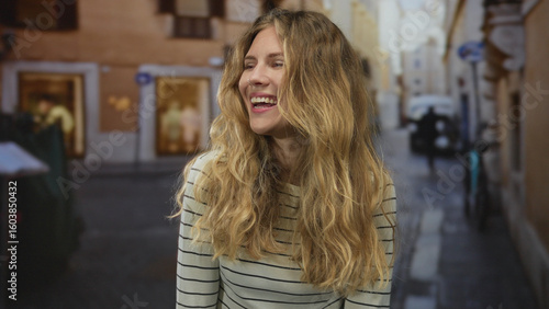 Woman hair smile on street portrays blonde young happy candid city natural moment.