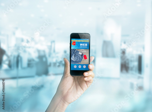 Woman hand and smartphone web design site on shopping mall background
