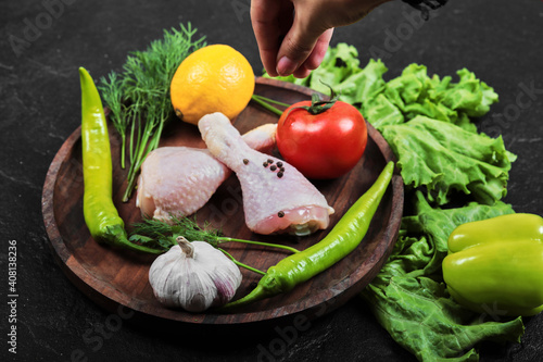 Woman hand holding a wooden plate of raw chicken legs with fresh vegetables
